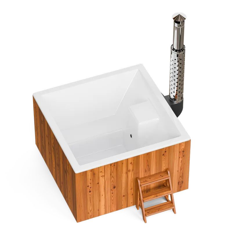 This tub can be used outdoors in any weather conditions. Our built-in 35 kW wood stove has been engineered to heat up the water to an optimal bathing temperature in about 1.5–2 hours. Equipped with a protective shield on the funnel, heat-resistant glass & German gelcoat internal composite our wood-fired hot tubs are built to the highest safety standards.