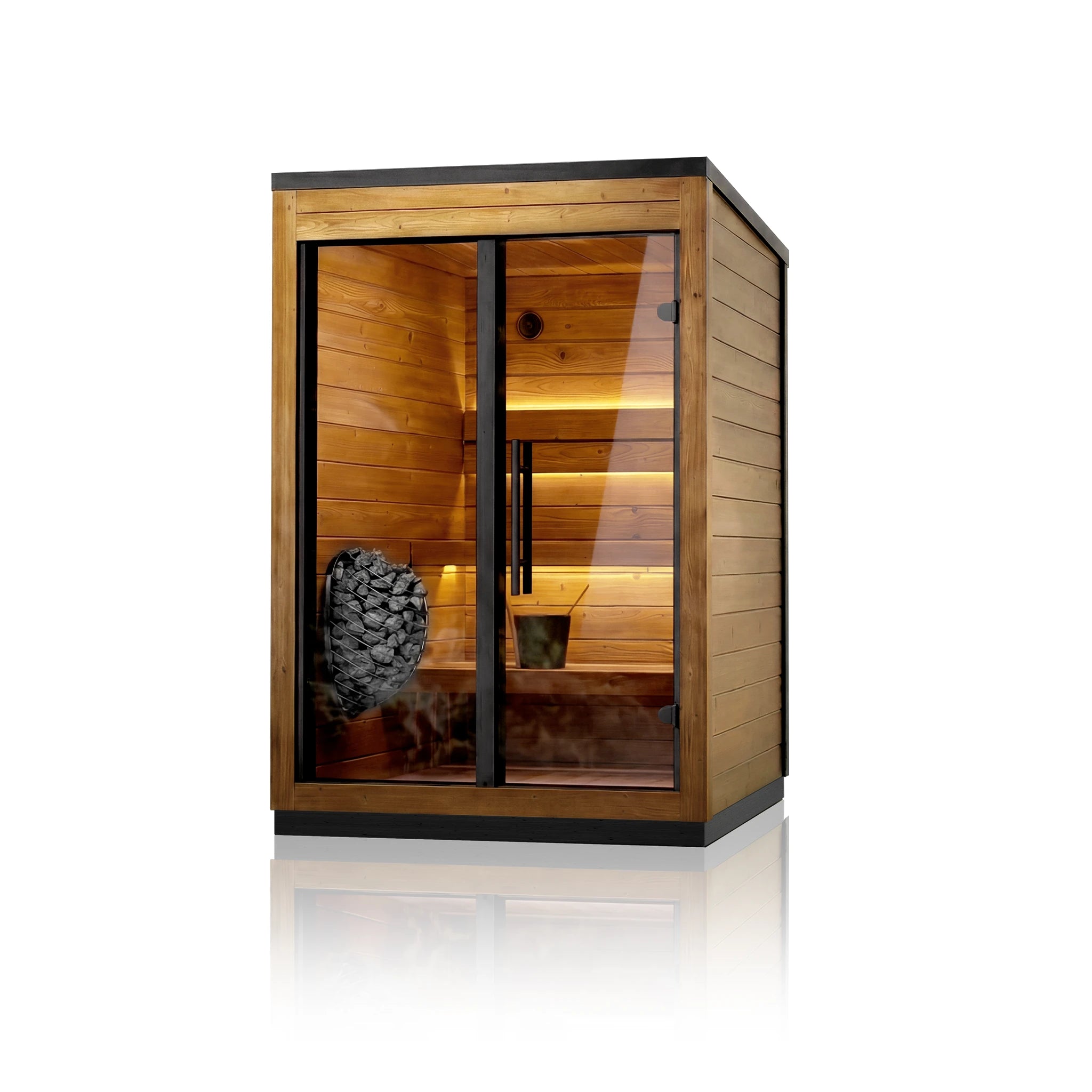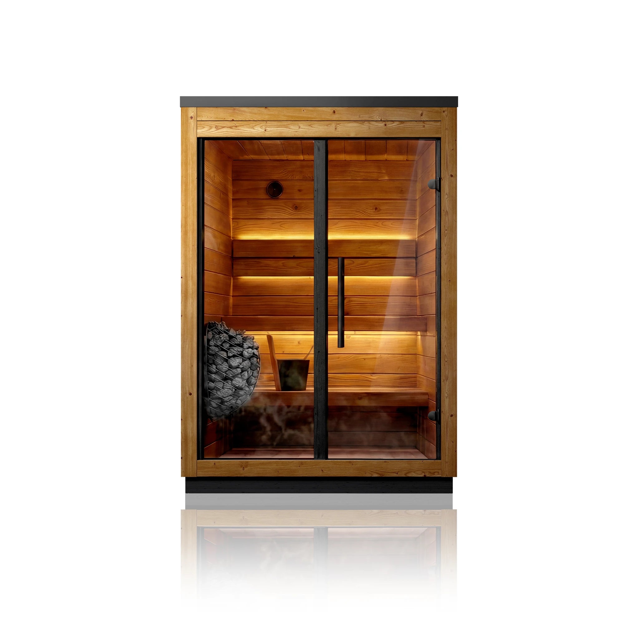Halo 2-Person Standard Outdoor Sauna is the compact, modern design — built for efficient heat, a bright glass front, and an installation-ready outdoor log construction. With its smaller footprint and full-height glass entry,The Halo is ideal for patios, decks, and tight backyard spaces while still delivering an authentic sauna experience.