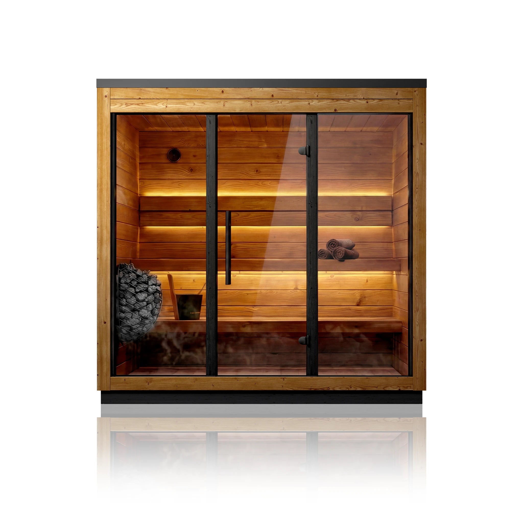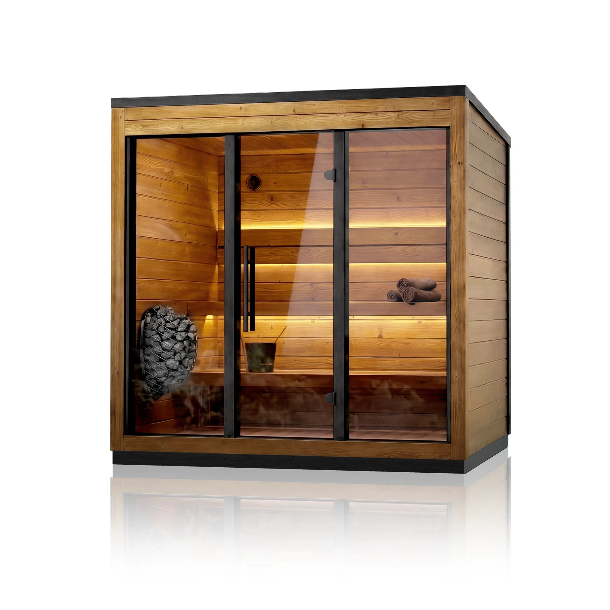 Le sauna extérieur Scandinavian Halo pour 3 personnes (2,1 x 1,5 m) est un sauna moderne et épuré, conçu pour une chaleur efficace, une lumière naturelle abondante et une installation simple et rapide. Il est doté d'une façade entièrement vitrée (porte et panneaux de verre assortis). Sauna extérieur scandinave Halo pour 3 personnes (7x5) crée une impression d'espace et de luminosité tout en conservant un encombrement réduit qui s'intègre parfaitement aux patios, terrasses et espaces de bien-être extérieurs.
