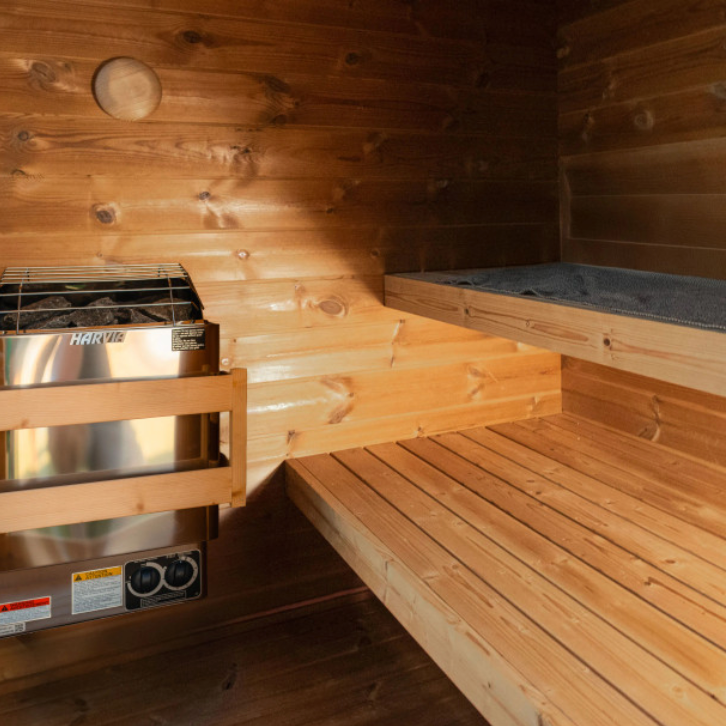 Fabriqué à partir de rondins traités thermiquement et doté d'un toit en caoutchouc EPDM durable, le sauna extérieur Scandinavian Halo pour 3 personnes (2,1 x 1,5 m) est conçu pour une utilisation fiable en extérieur toute l'année. Un système de banquettes bien pensé (une banquette supérieure et deux banquettes inférieures) permet des séances confortables en position assise, tandis que des dispositifs de ventilation intégrés assurent une circulation d'air optimale pendant l'utilisation.
